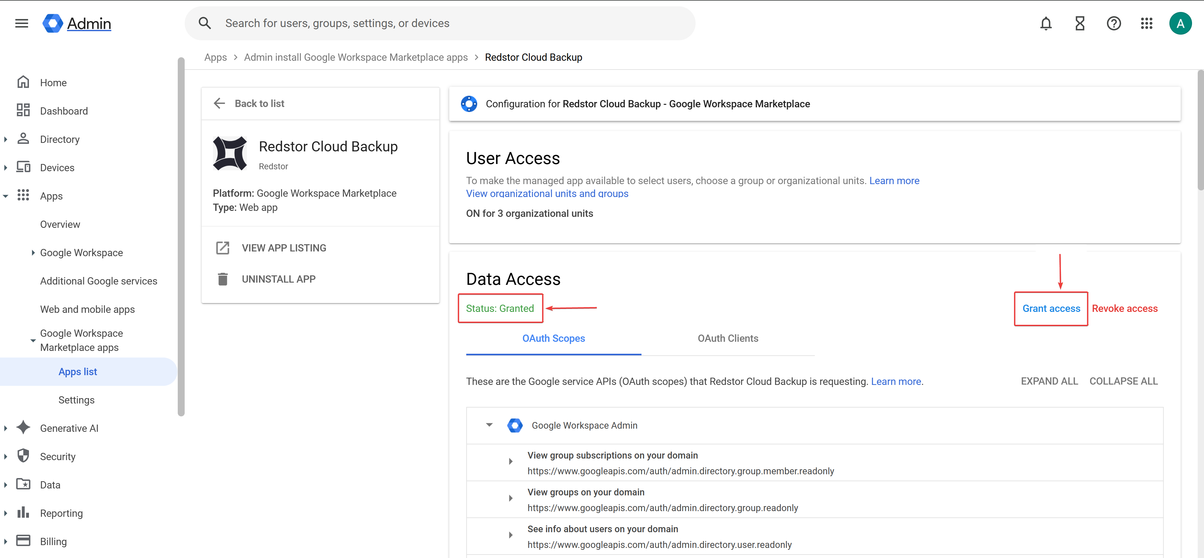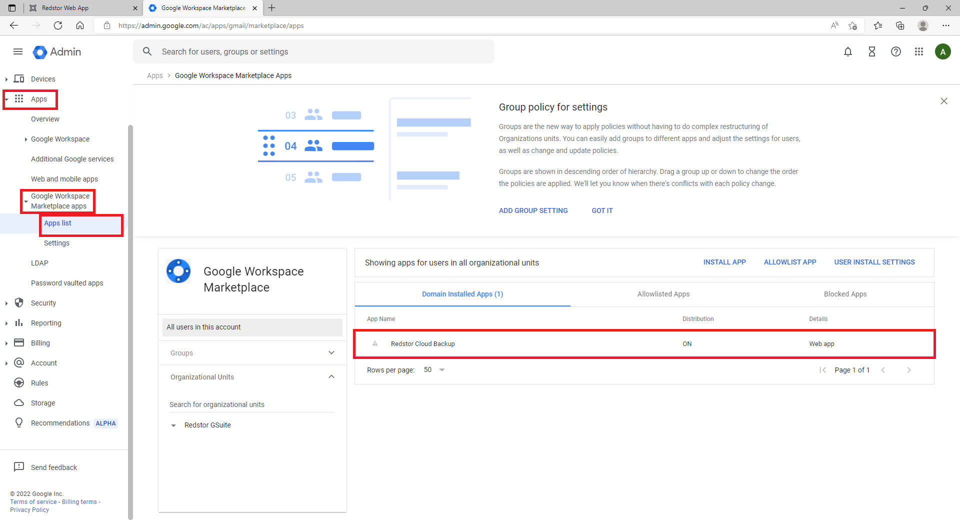 1. Under Google Workspace Marketplace apps > Apps list, the Distribution setting for Redstor Cloud Backup should show as ON.
