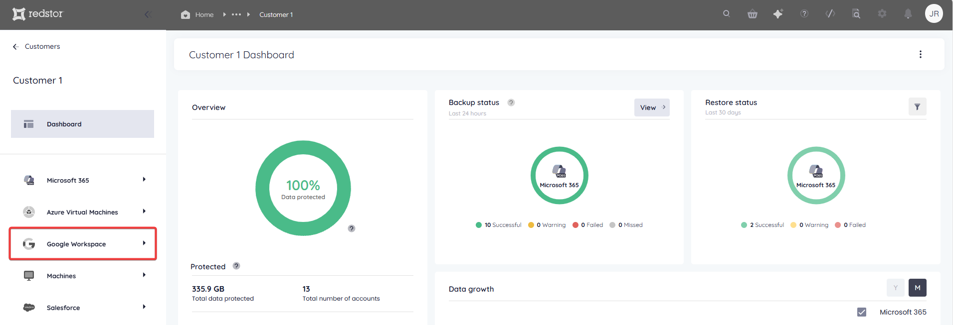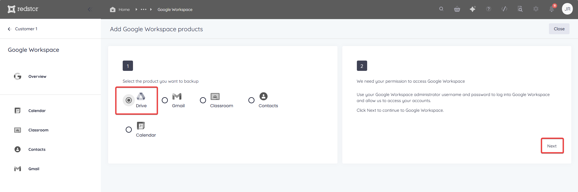 2. To add a new backup set, go to Google Workspace in the sidebar on the left. If you do not see Google Workspace listed, you will need to add it as a product.