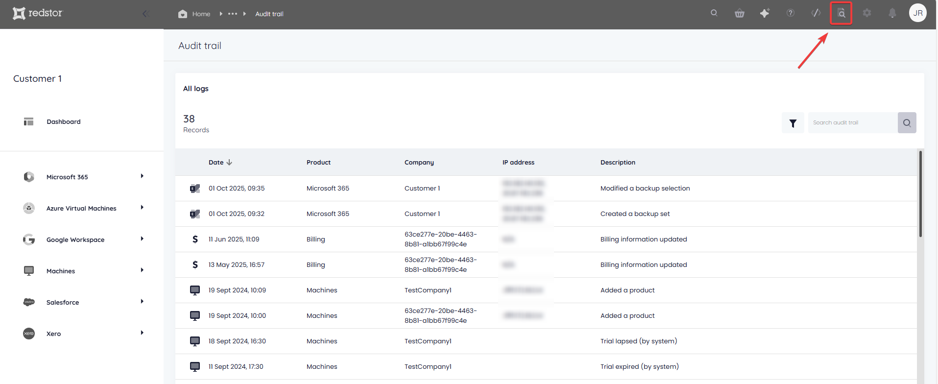To view an audit trail of key actions and which users performed them, click on the inspect icon at the top right of the page.
