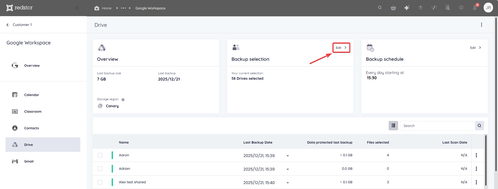 1. On the backup set home page, go to Edit on the Backup selection card.