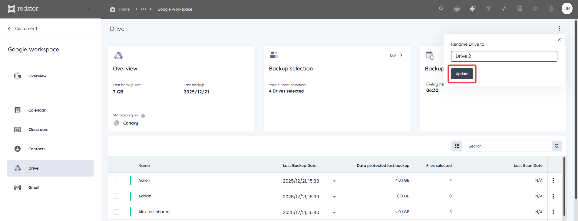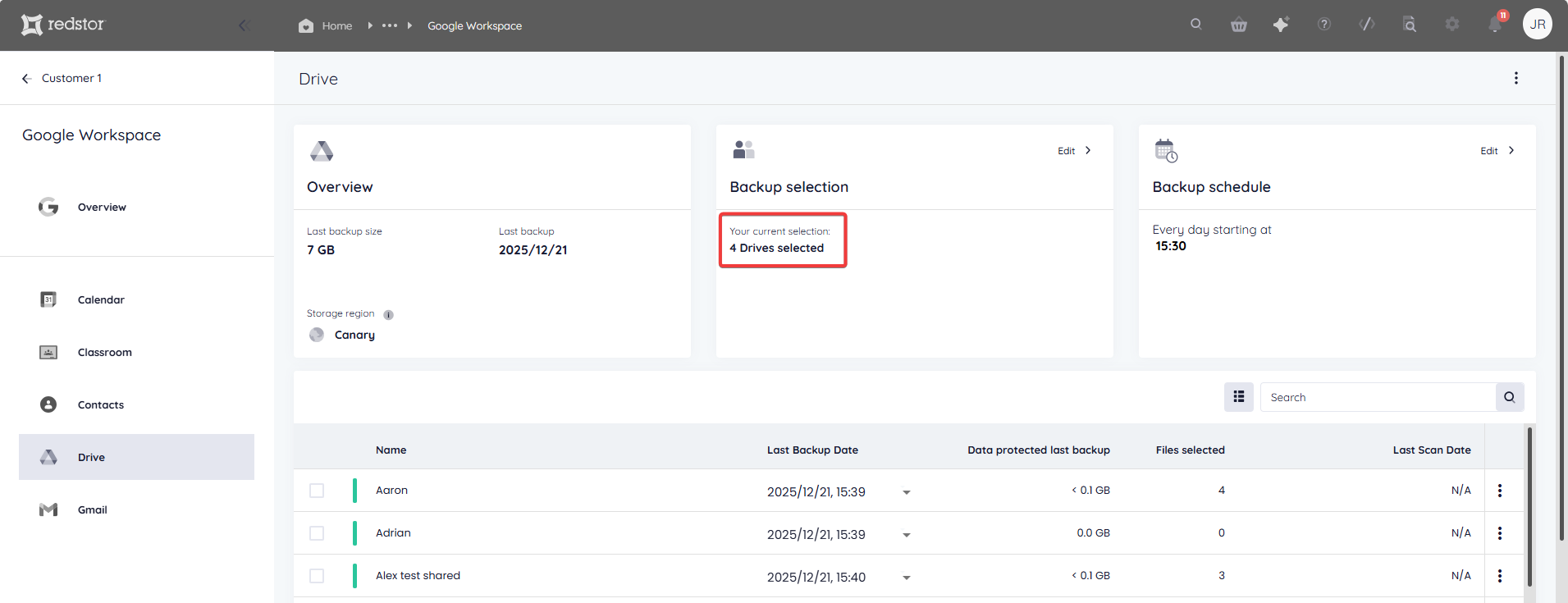 Backup and recovery of Google Drive forms part of our Google Workspace service offering. We can also protect native Google file formats (Docs, Sheets, etc.) as part of your Drive contents. Watch our video to learn more.