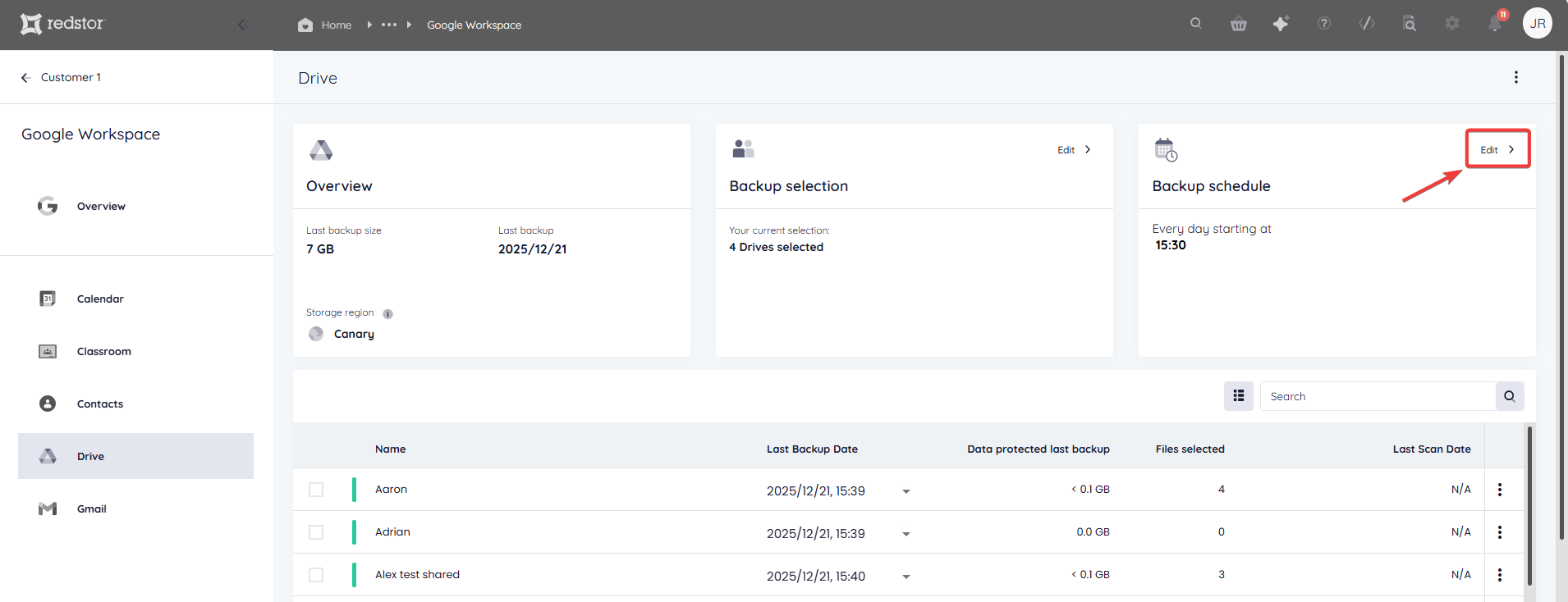 1. On the home page for the backup set, click on Edit on the Backup schedule card.
