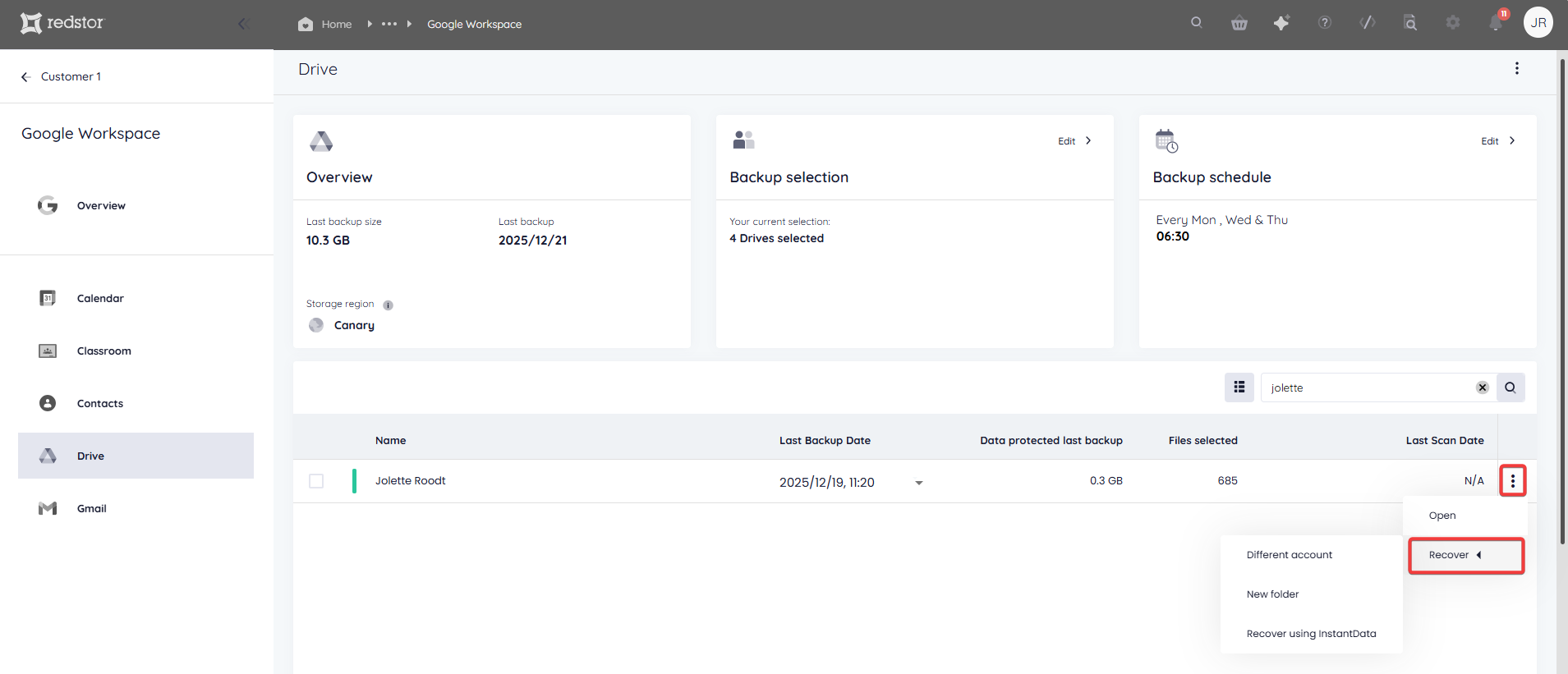 - Different account recovers the drive's data to a folder named Redstor Restores in another Google Drive. Within this folder will be a folder with the selected backup date's timestamp as its name. This is where the data will be recovered. To proceed with this recovery method, you will need to specify the drive you want to recover to.