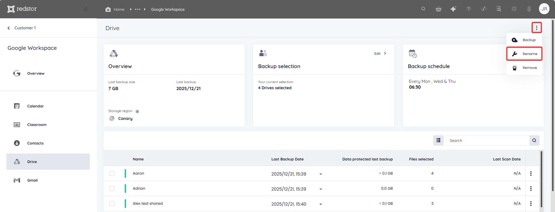 1. On the home page for the backup set, click on the menu icon at the top right and go to Rename.