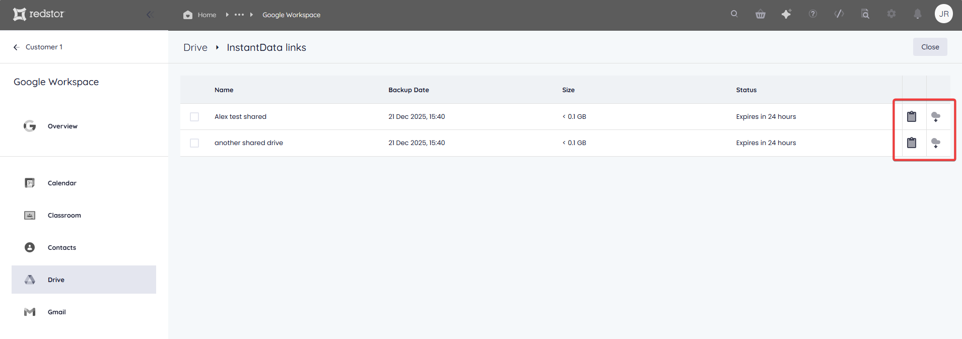 For InstantData restores, use the Copy option to share a link to the InstantData application, or Download the application immediately. Each link can only be used to initiate one restore.