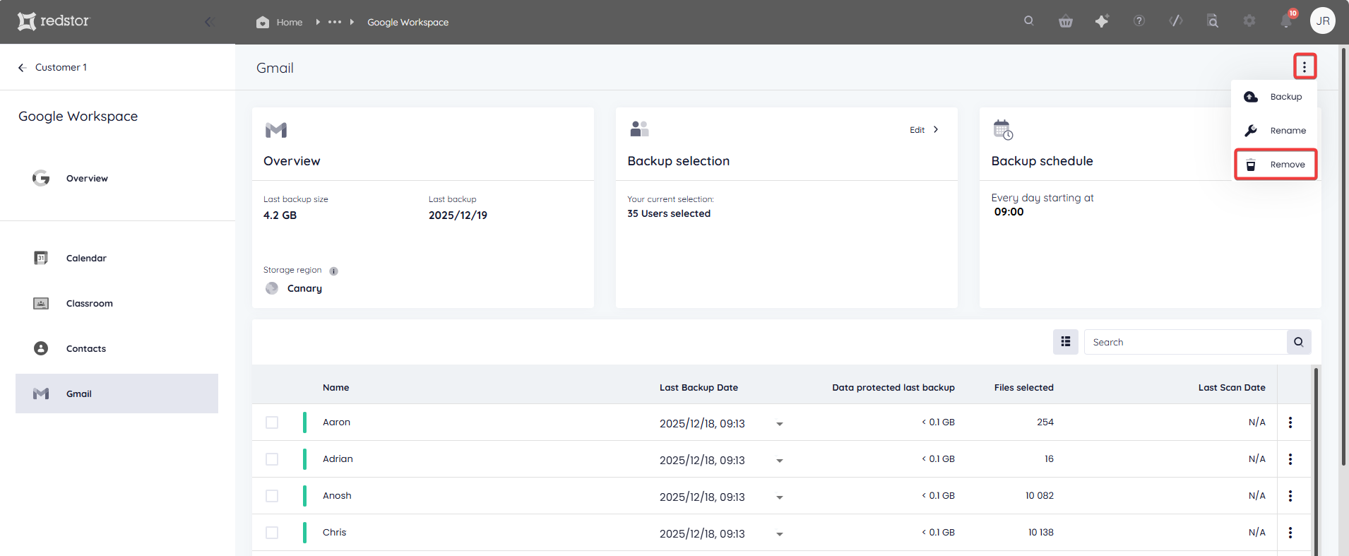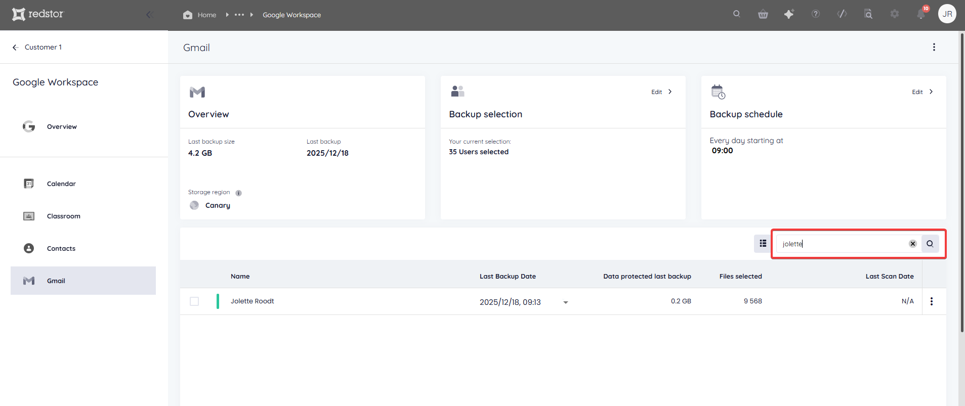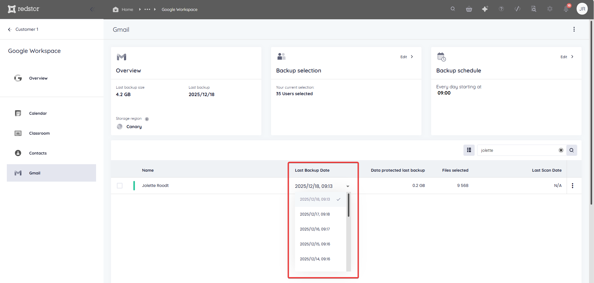 - Important: If a Google Workspace user leaves your organisation, do not delete the user. Redstor has no way of restoring a deleted user's Contacts or Calendar. Gmail can be restored to a different account. If you withdraw the departing user's Google Workspace licence, even if you do not delete the user, Google is under no obligation to retain that user's data. The data may appear to remain present but can be removed by Google at any time as part of cleanup. Consider assigning an archive licence or exporting the data for alternative storage instead.