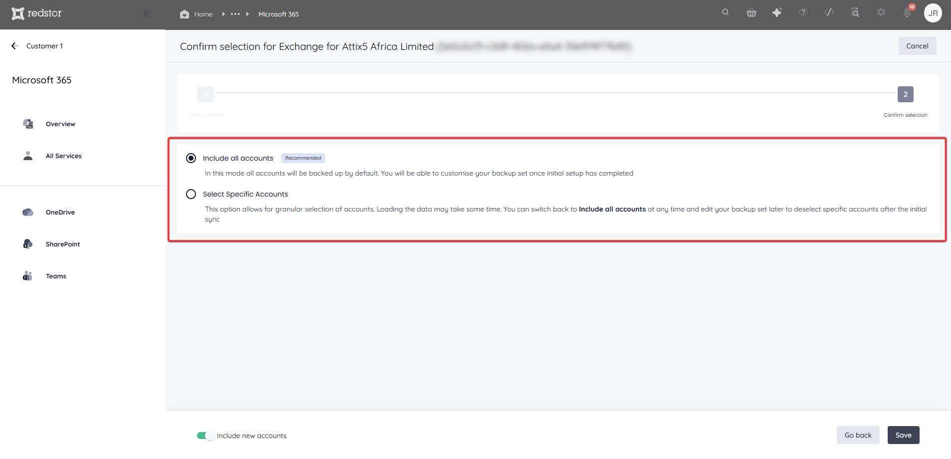 - Include all accounts (faster): This option creates a backup set that includes all accounts in the tenant. You can edit this selection at any time after the setup is complete by following the steps in How to edit a backup set below.